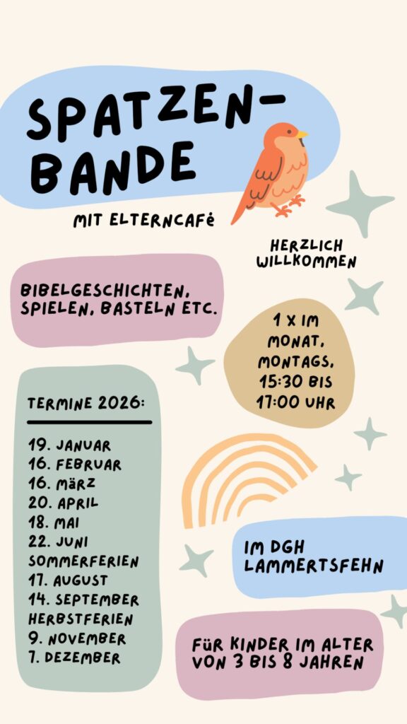 Herzliche Einladung zur Spatzenbande. Ein Kindertreff für Kinder von 3-8 Jahren. Ein tolles Programm wartet auf Euch. Die Mamas, Papas, Omas… dürfen es sich im Elterncafé gemütlich machen.